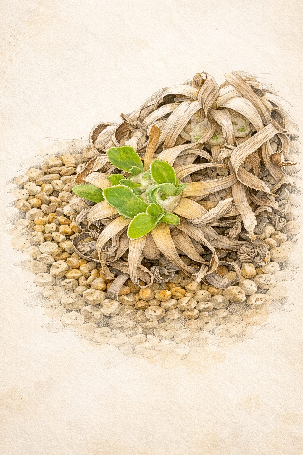 - 夏の休眠期には枯れるが、落葉せずに枯れ葉が株を覆う